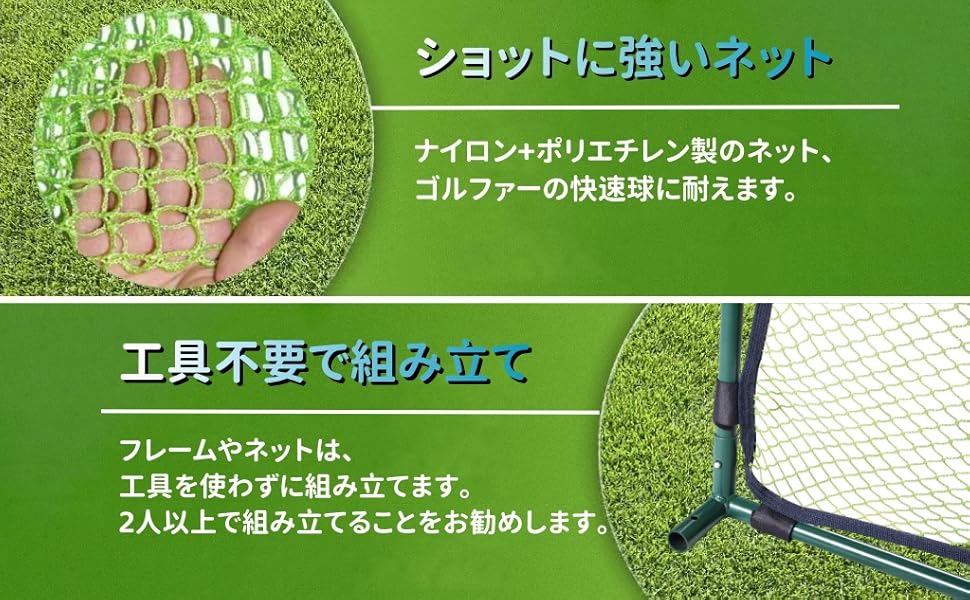 - ゴルフネットの安定性と設置:ポールとネットは軽量設計で、工具不要で簡単に組み立てられます。使用しない時はコンパクトに収納でき、持ち運びも容易です。このゴルフネットは、プロからアマチュアまで、すべてのゴルファーが効率的に練習できるよう設計されています。高さ2.35m、奥行1.4mのサイズは、自宅でのゴルフ練習に最適です。耐久性と使いやすさを兼ね備えたこの製品は、あらゆる環境での練習をサポートします。