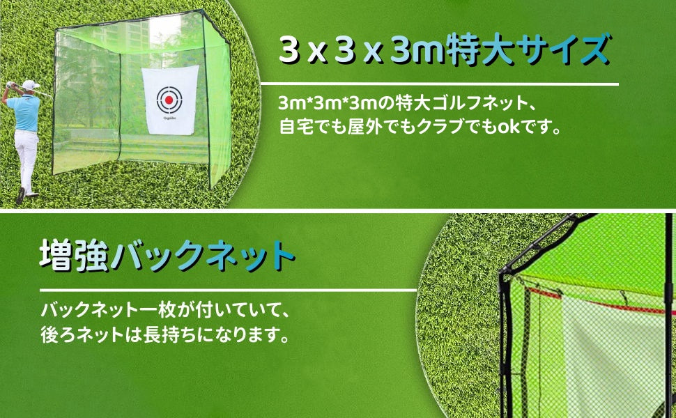 - 各場所に大活躍:お庭やガレージなど、さまざまな場所に設置でき、自宅練習場になっていつでも練習できます。ご注意:屋外で設置する場合は、ペグや重りなどで固定すると、練習がもっと安心になります。