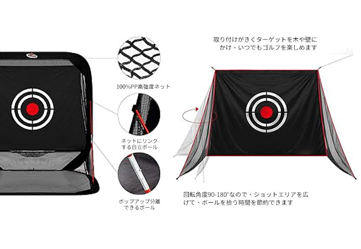 - ゴルフスキルを向上させる:オープンサイズは2.1m(幅)x2.1m(高さ)x1.8m(奥行)。本店のゴルフネットは、ターゲットが付き、ドライブやスイングなど、様々なヒットの練習ができます。自動返球ネット構造で、ボールを拾う時間を節約し、練習をよう効率的にすることができます。