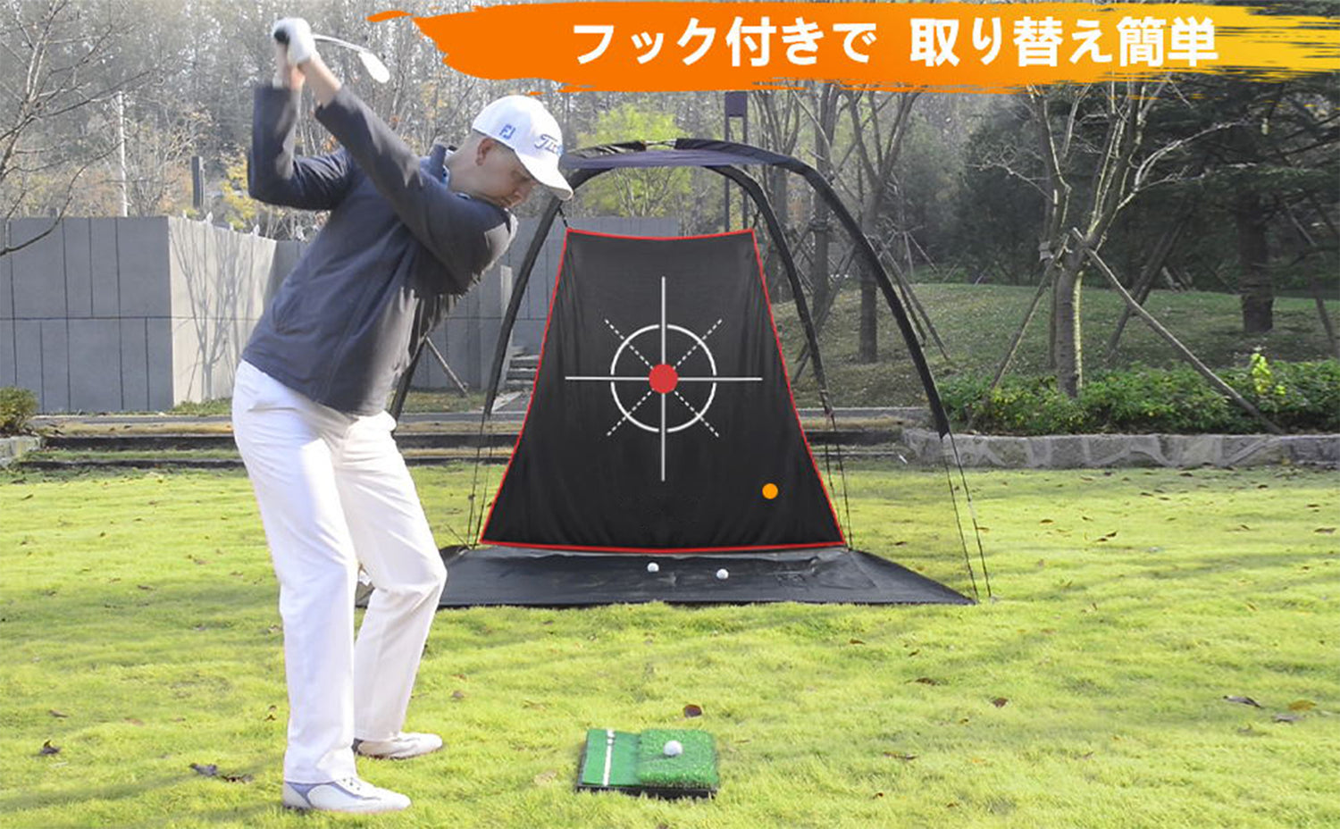 ターゲットは四つのs形フックが付いています。フックを本店の2.4x1.8x1.5mゴルフネットにかけるだけで使えます。