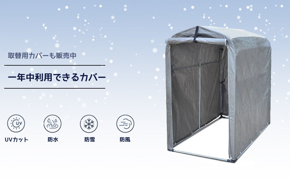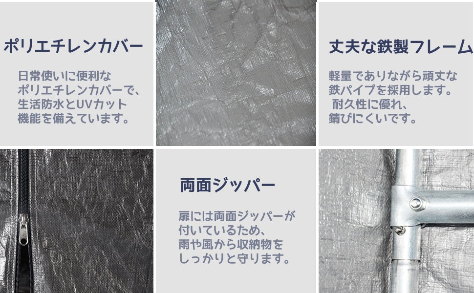 ポリエチレン製の生地、鉄製のフレーム、どれも耐久性が高く長時間使用することが可能です、耐久性だけではなく、防水性もちゃんと備えているため、雨、風と雪などからしっかり収納物を守れます