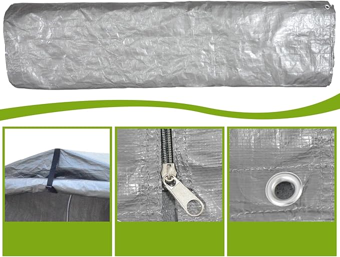 防水性:カバーには前方に入り口があり、自転車の出し入れが容易です。ファスナーを閉めると密閉されたガレージになります。雨や雪から自転車を守るために、撥水加工されています。これにより、自転車などを湿気や水から守り、長期間の保存に適しています。 - UV耐性: 太陽光や紫外線から自転車やカバー自体を保護するため、UV耐性が備わっています。これにより、カバーの色あせや劣化を防ぎ、長期間の使用を可能にします。