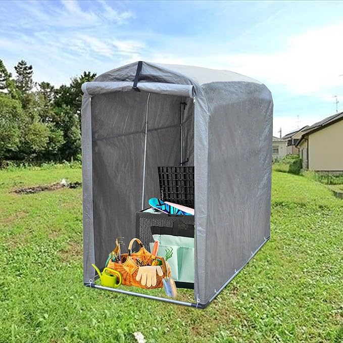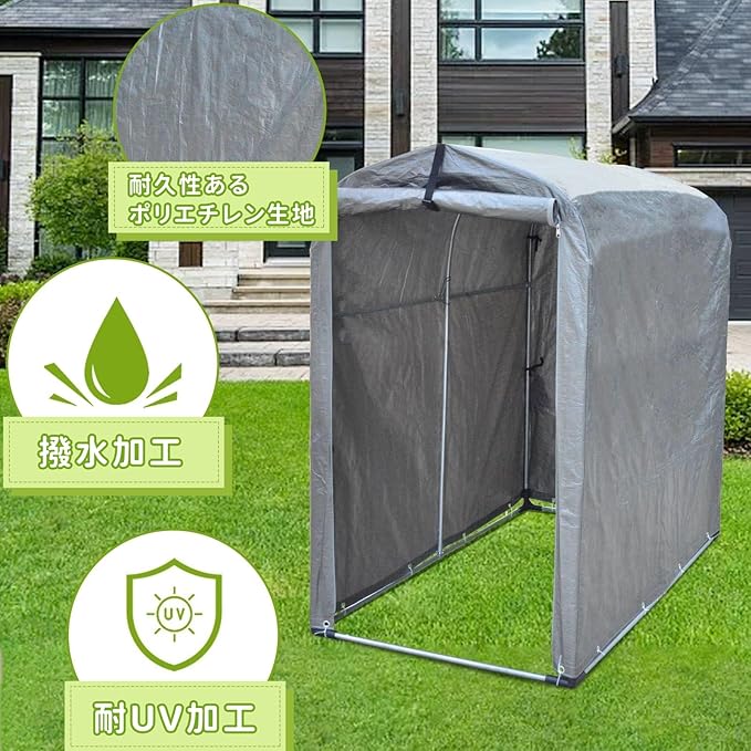 ポリエチレン製の生地、鉄製のフレーム、どれも耐久性が高く長時間使用することが可能です、耐久性だけではなく、防水性もちゃんと備えているため、雨、風と雪などからしっかり収納物を守れます