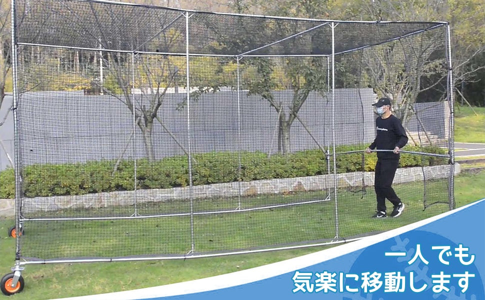 - 使いやすい設計:バッティングケージの前には選手が出入りできる開口部があり、後ろには2つのホイールがついているので、前の横バーを持ち上げるだけで、一人で簡単にバッティングゲージを移動できます。