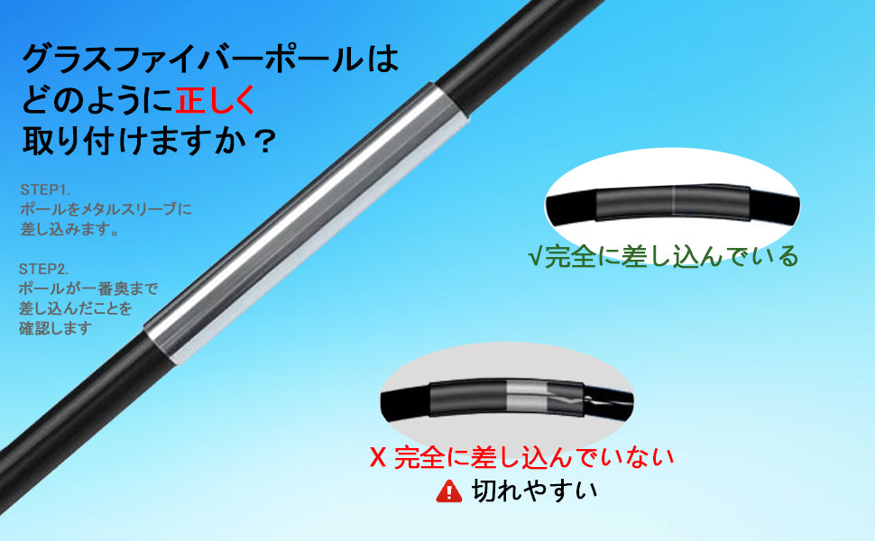 - 「ご注意ください」組立中にグラスファイバーポールを折れないように、接続部分を奥まで差し込んでください。雨や雪の日では製品が損傷する可能性がありますので、悪天候の場合は製品を収納することをお勧めします。