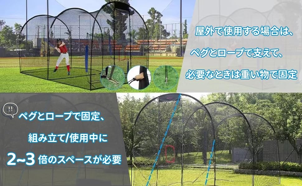 - 「バッティングゲージ」サイズ:高さ*幅*長さ:3x3x5m 収納サイズ:76x35x31cm 重量: 18.2kg 素材:テトロン、グラスファイバー、鉄 ※ご注意:本バッティングケージはペグとロープで固定されており、組み立てと使用中に2倍のスペースが必要です。